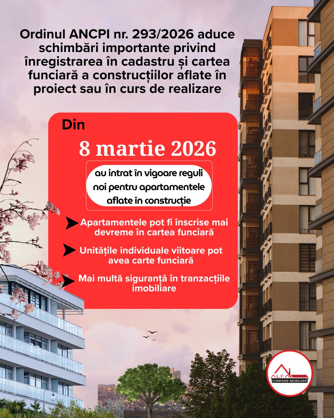 In martie 2026, a fost publicat in Monitorul Oficial, Ordonul nr. 293/2026, emis de Agentia Nationala de Cadastru si Publicitate Imobiliara (ANCPI), care modifica si completeaza Regulamentul de receptie si inscriere in evidentele de cadastru si carte funciara aprobat prin Ordinul nr. 600/2023. Noile prevederi introduc reguli mai