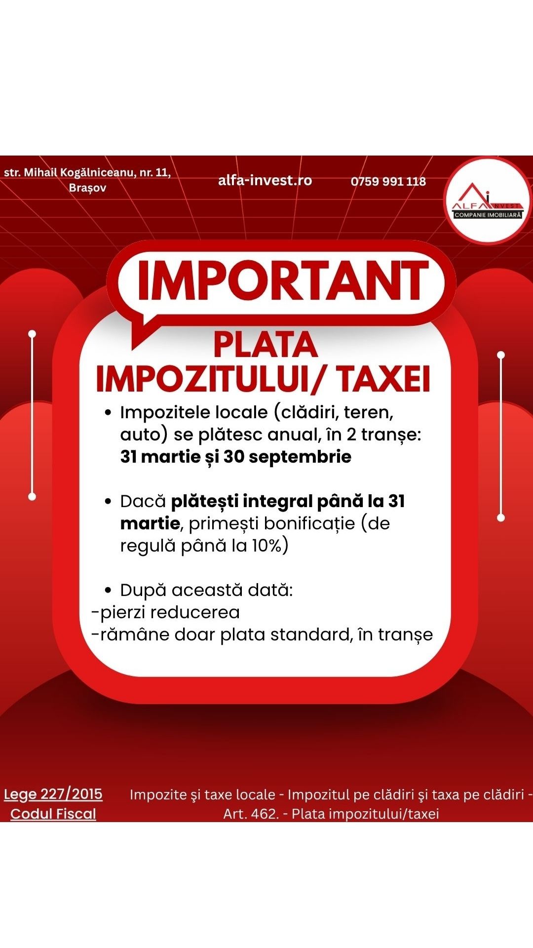 Daca esti proprietar si detii un apartament, o casa, un teren sau un autoturism, este important sa stii ca momentul in care alegi sa platesti impozitul local, poate face diferenta in bugetul anual. Desi plata impozitelor este o obligatie, exista si un avantaj de care poti profita, daca
